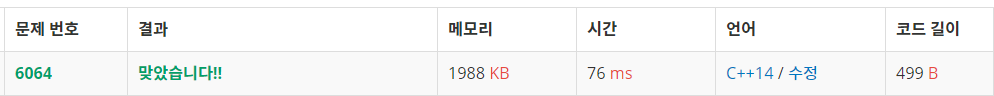 문제 최근에 ICPC 탐사대는 남아메리카의 잉카 제국이 놀라운 문명을 지닌 카잉 제국을 토대로 하여 세워졌다는 사실을 발견했다. 카잉 제국의 백성들은 특이한 달력을 사용한 것으로 알려져 있다. 그들은 M과 N보다 작거나 같은 두 개의 자연수 x, y를 가지고 각 년도를 와 같은 형식으로 표현하였다. 그들은 이 세상의 시초에 해당하는 첫 번째 해를 <1:1>로 표현하고, 두 번째 해를 <2:2>로 표현하였다. 의 다음 해를 표현한 것을 이라고 하자. 만일