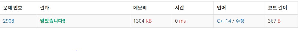 문제 상근이의 동생 상수는 수학을 정말 못한다. 상수는 숫자를 읽는데 문제가 있다. 이렇게 수학을 못하는 상수를 위해서 상근이는 수의 크기를 비교하는 문제를 내주었다. 상근이는 세 자리 수 두 개를 칠판에 써주었다. 그 다음에 크기가 큰 수를 말해보라고 했다. 상수는 수를 다른 사람과 다르게 거꾸로 읽는다. 예를 들어, 734과 893을 칠판에 적었다면, 상수는 이 수를 437과 398로 읽는다. 따라서, 상수는 두 수중 큰 수인 437을 큰 수라고 말할