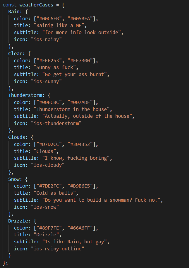 날씨 경우의 수는 다음과 같이 뒀다. Rain, Clear, Thunderstorm, clouds, snow, drizzle! 그리고 바꿔준 Weather function은 다음과 같다.