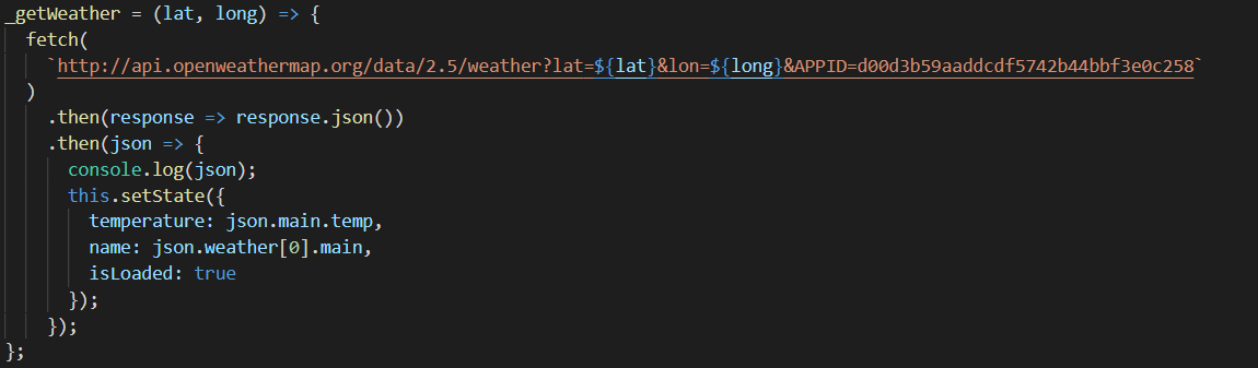 사용한 오픈 API는 openweathermap인데, 사용 방법은 사이트에 더 자세하게 적혀있다. 로그인하고 구독하면 API 받아올 수 있음 ㅇㅇ! 저기 appid 부분이 키값이 된다. 주의사항 .. '쓰면 안되고 `써야한다! 주소 안에 변수를 넣어주기 때문에..!!