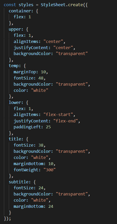 upper 부분이 아이콘과 온도가 들어갈 부분이 되고, lower 부분이 title이 들어갈 부분이 된다. 둘의 비율은 같게 해줄 것이므로 flex를 1로 준다. flex가 큰 부분이 더 큰 비율을 차지하게 된다고 생각하면 된다!