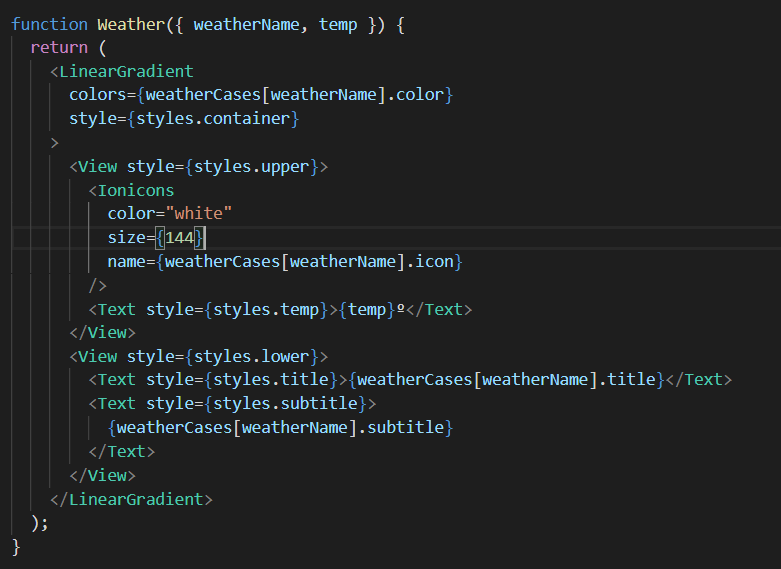 colors 부분은 저렇게 만들면 첫번째 색깔부터 두번째 색깔까지 자연스럽게 그라데이션이 된다. 같은 크기를 가지는 view를 두 개 주고, 첫 번째 view안에는 icon과 text를 넣어주었다. 이때 여기 오는 text가 온도를 나타내는 text가 된다!
